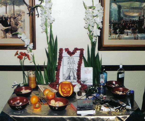 Many people - especially the women - were in fancy dress. But instead of the usual 'trick-or-treat' ghouls they sported Elizabethan costume of the commoners - just the kind of garb that would have been worn by the 'Winchester Geese'. The large basement room was decorated with flowers and two alters; one, for our own beloved dead, was designated as an 'Altar to the Ancestors' [SLIDE 2]. The other was dedicated to the prostitutes of Cross Bones. This second altar was laden with suitable offerings: chocolate, cigars and a bottle of gin. [SLIDE 3].