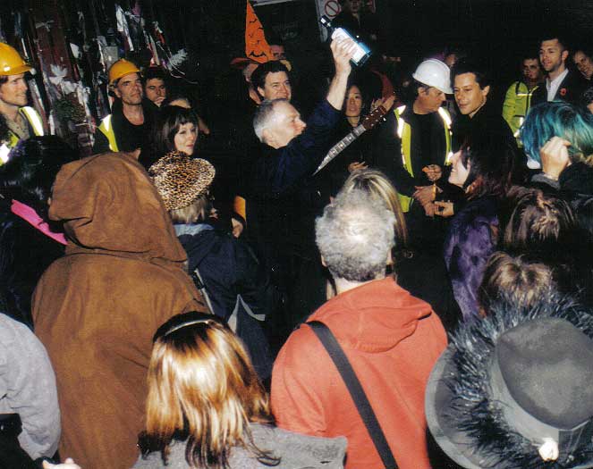The festival was celebrated in two parts, with the bulk of the evening taken up with indoor performances which served to frame the final procession to the gates of the nearby graveyard. These performances consisted of songs and poems from The Southwark Mysteries and a demonstration of 'Tantric' breathing techniques from Jahnet de Light and her 'Whores D'oeuvres' [SLIDE 4]. This photograph shows John Constable - or more like, John Crow - performing part of The Southwark Mysteries.