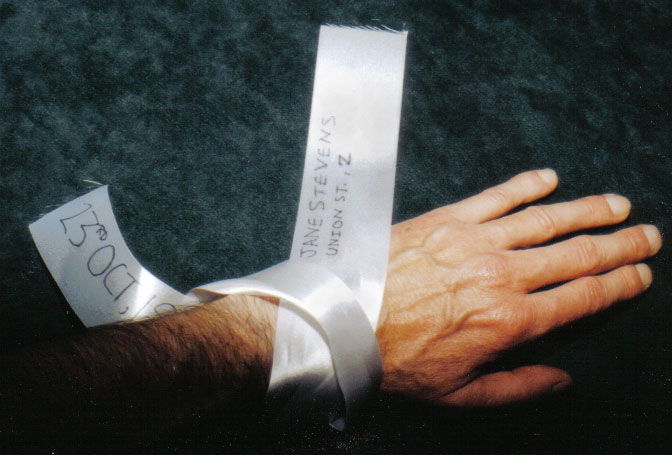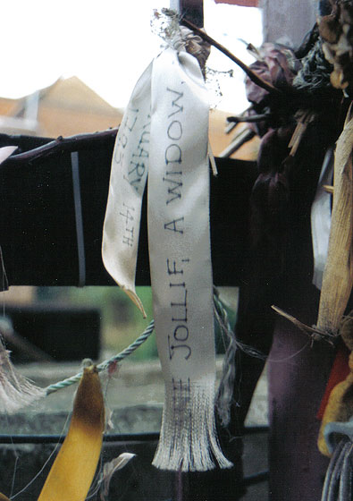 The 2007 Cross Bones Halloween began in the basement room of a bar close to the graveyard. On arrival each celebrant had a white ribbon tied around their wrist. [SLIDE 1]. The ribbon gave the name, address, profession and year of death of one of those buried in the graveyard6, and this was the spirit that you were invited to honour that night.